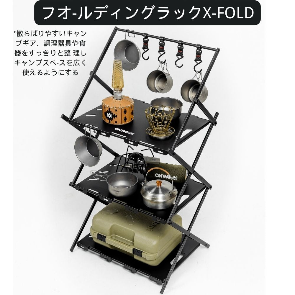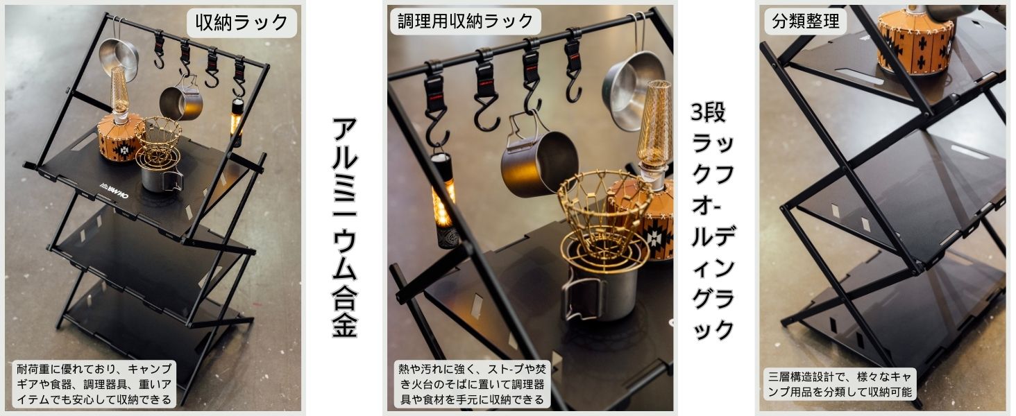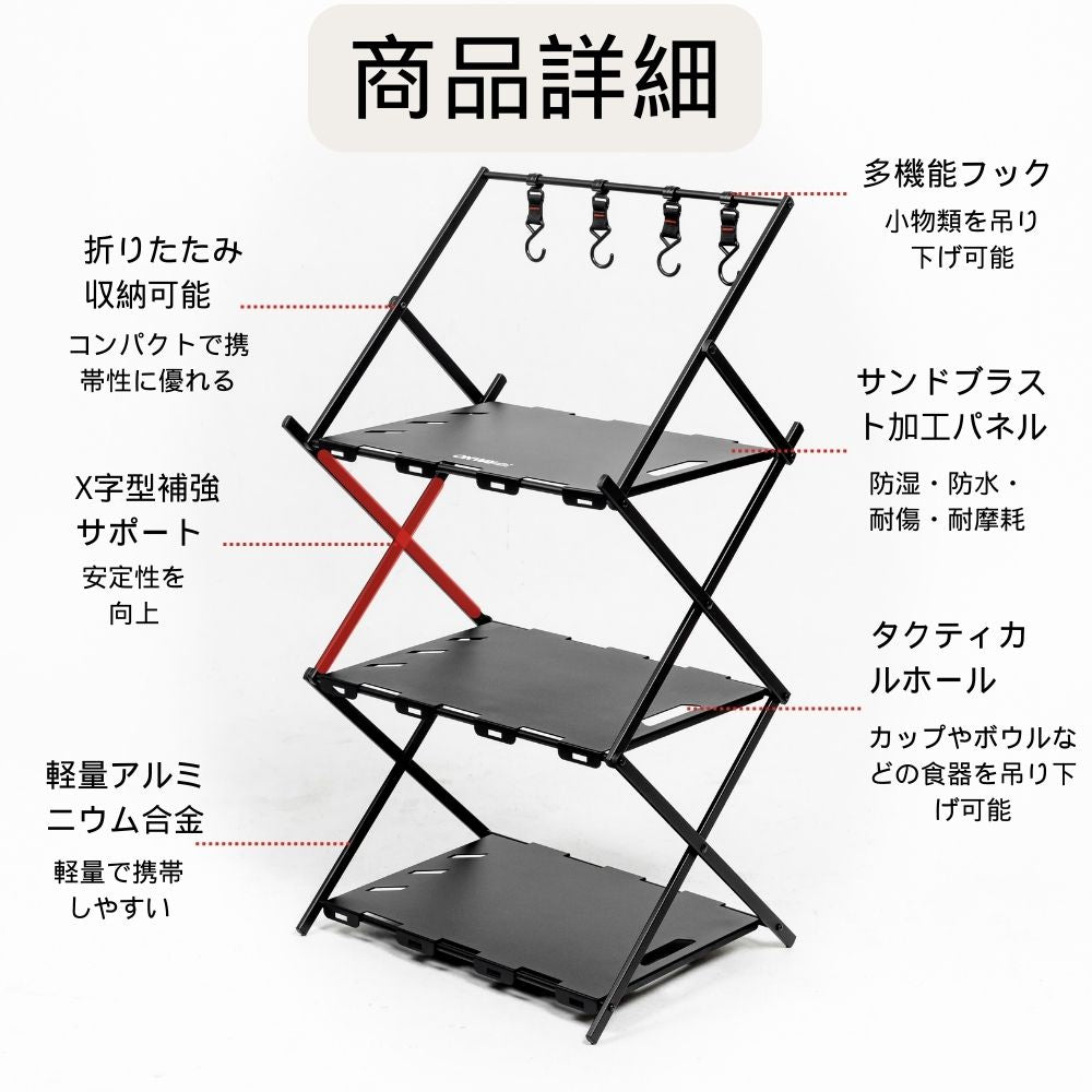 アウトドアラック キャンプラック フォールディングラック 3段物置き棚 折り畳み式 軽量 アルミ ハンガーフック4個付き 専用収納袋付き