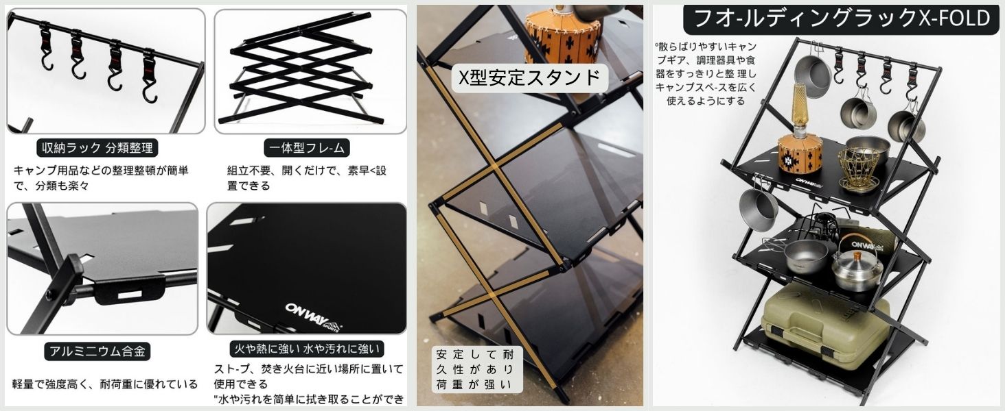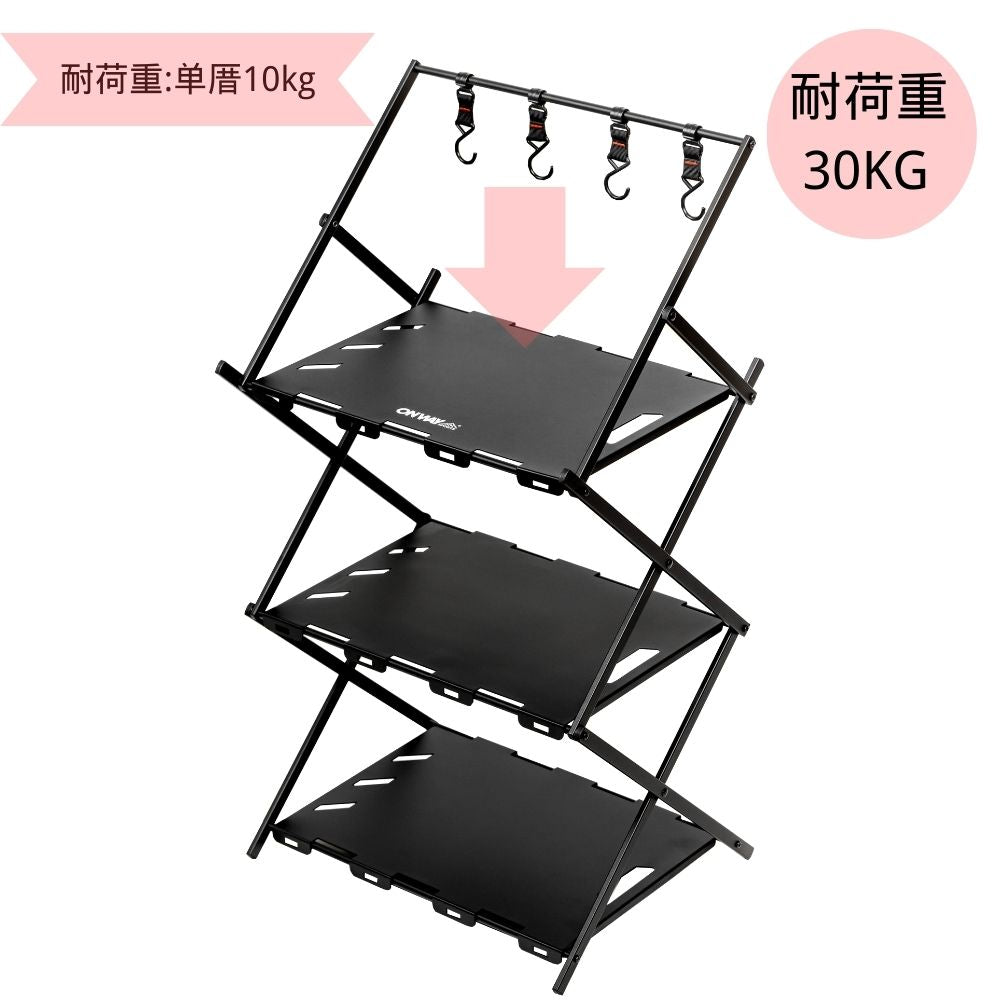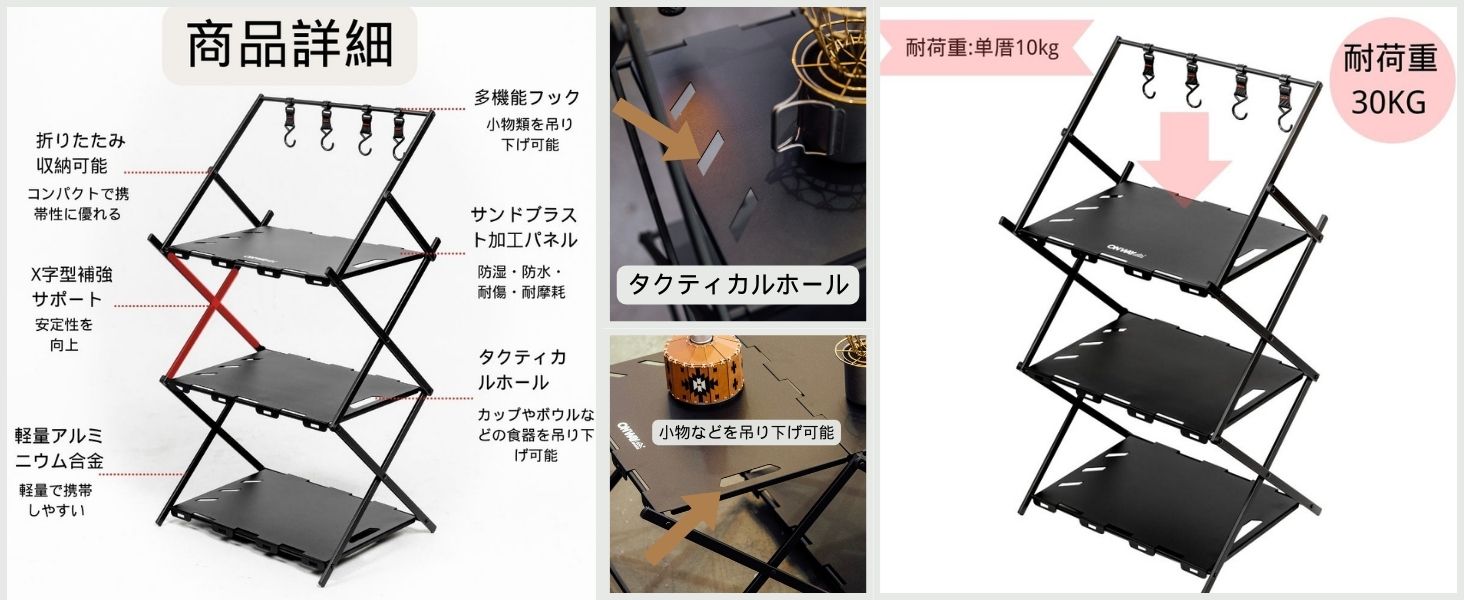 - 【収納性向上】キャンプラックは3段設計で、様々な物品を分類整理可能。各段の天板にはフック溝を設け、スノードームカップなどの小物類を吊り下げ可能。さらに4つの便利なスライド式フックを付属し、食器類やその他のキャンプ用品を吊り下げ収納できる。
