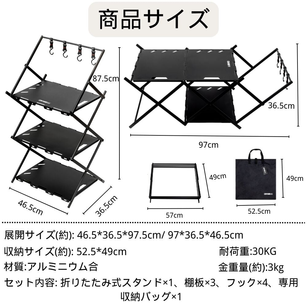 - 【サイズ】フィールドラック展開時サイズ:約H97.5×L46.5×W36.5cm。キャンプテーブル使用時展開サイズ:約97×46.5×35cm。収納サイズ:約49×57×6.5cm。重量:約3kg。各段耐荷重10kg、3段合計30kgまで対応。